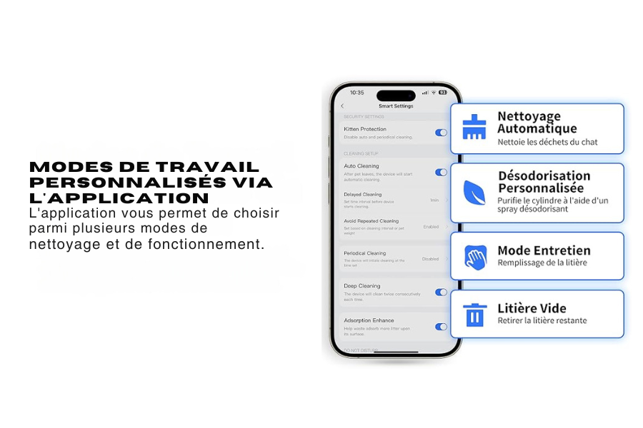 Une tranquillité d'esprit grâce à un suivi intelligent de votre chat via l’application mobile. Recevez des alertes en temps réel, surveillez les habitudes de votre compagnon, et contrôlez le nettoyage automatique où que vous soyez. Tout est pensé pour le bien-être de votre chat et votre confort.